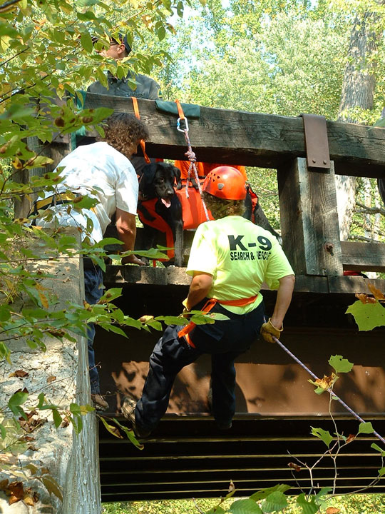 2007 - K-9 watches Handler Rappel before wearing a harness and being lowered. |